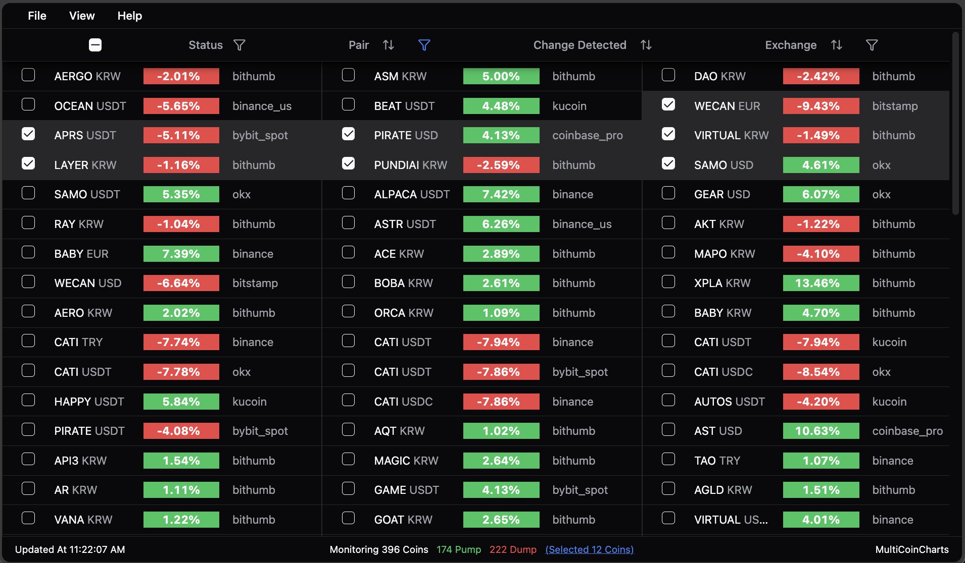 MultiCoinChart's Rapid Movers Scanner spots sudden price spikes and drops the moment they happen. It scans major exchanges in real time, highlights only the biggest movers, and alerts you instantly — so you can make faster, smarter trades without getting buried in noise.